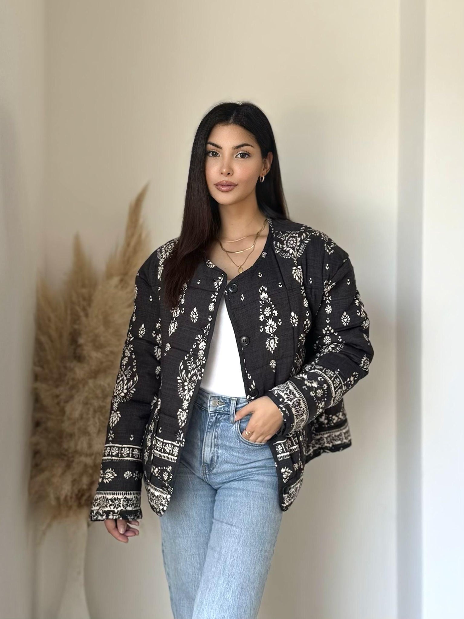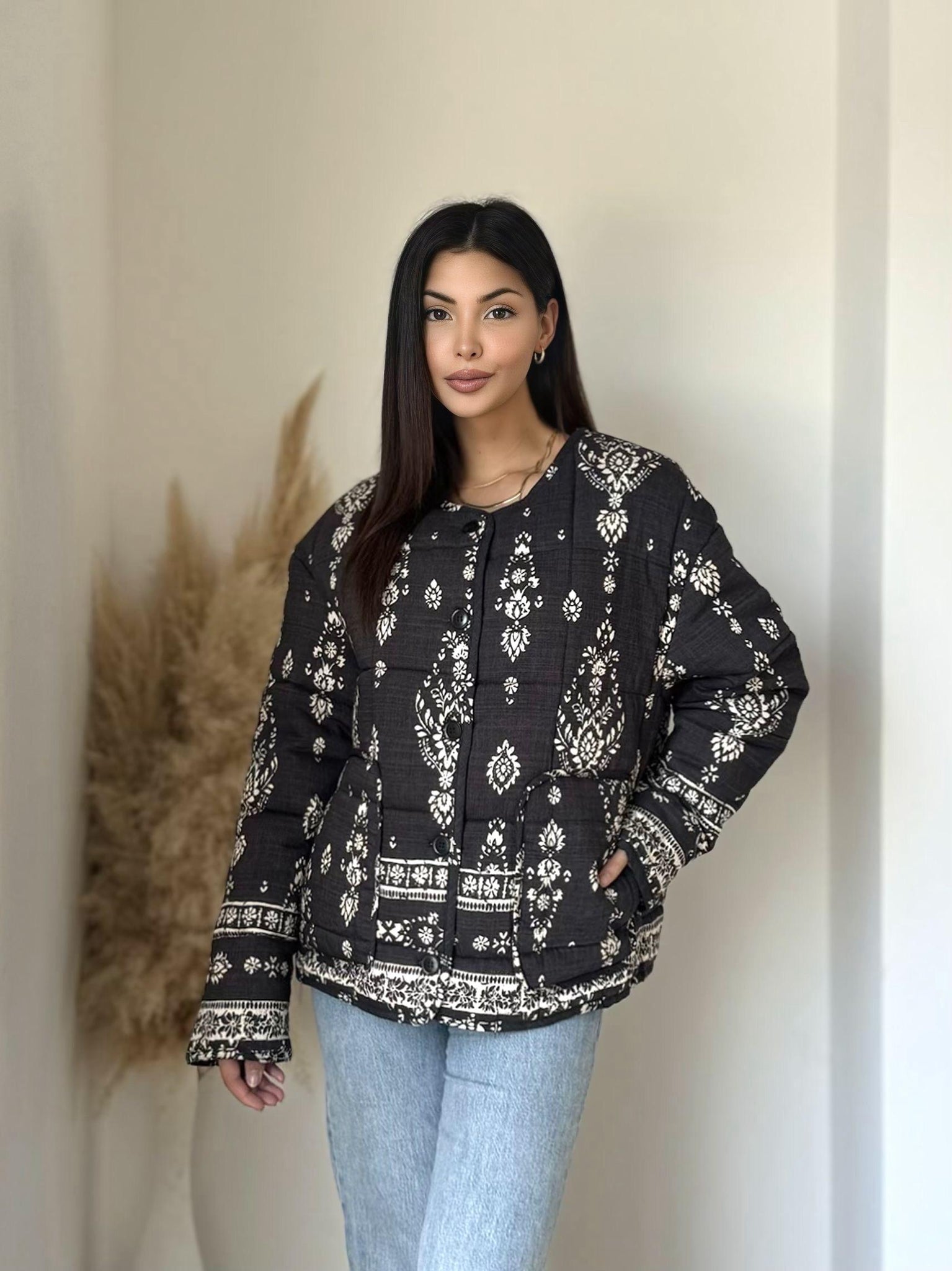 Lämmin tikkitakki välikeleille. Takissa on kaunis oriental tyylinen musta kangas boho-tyyliin.
