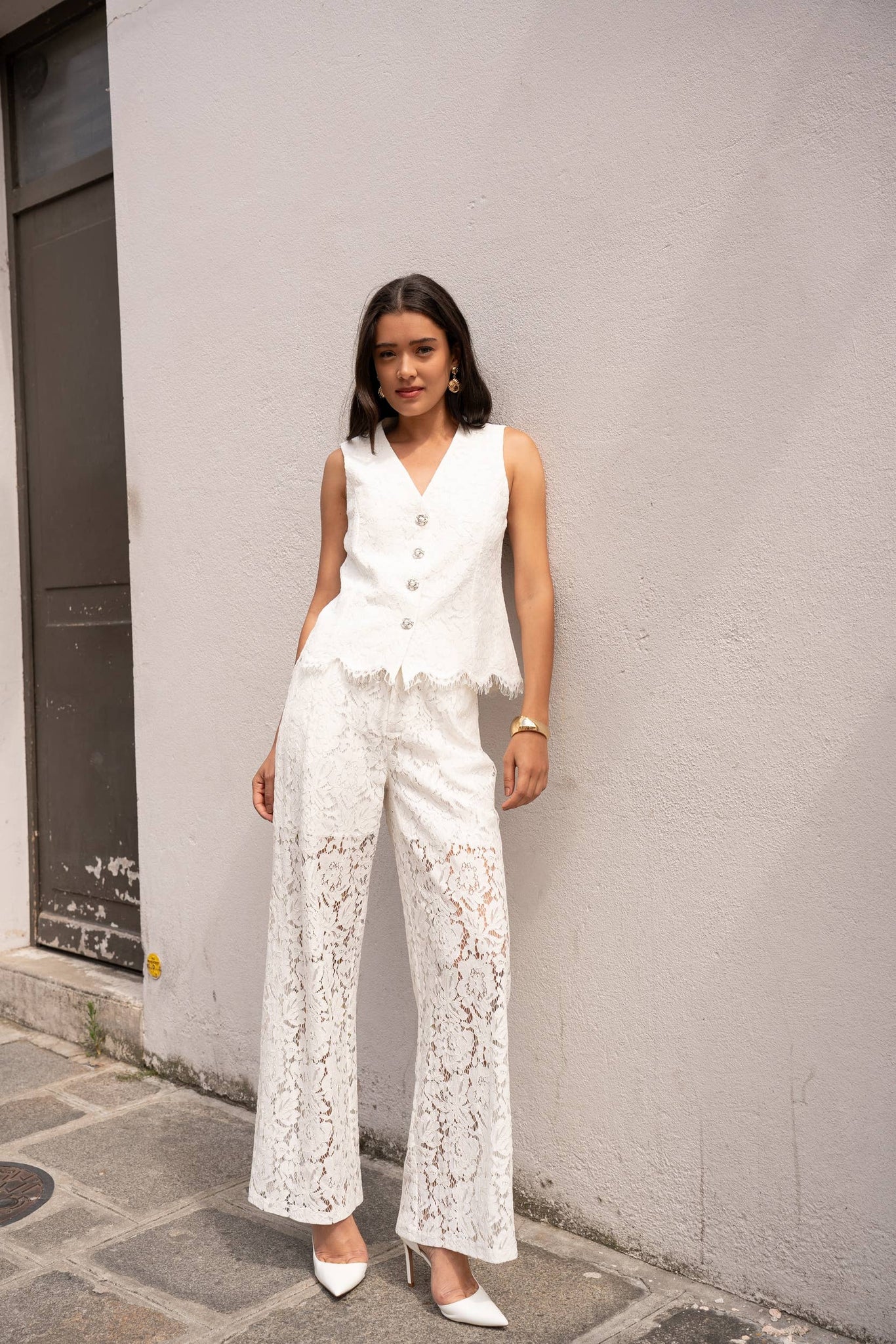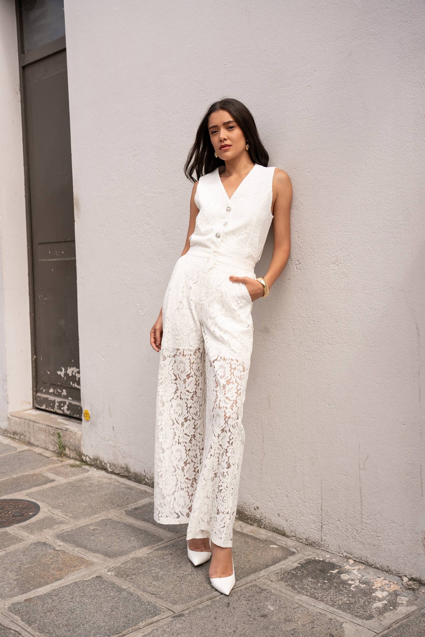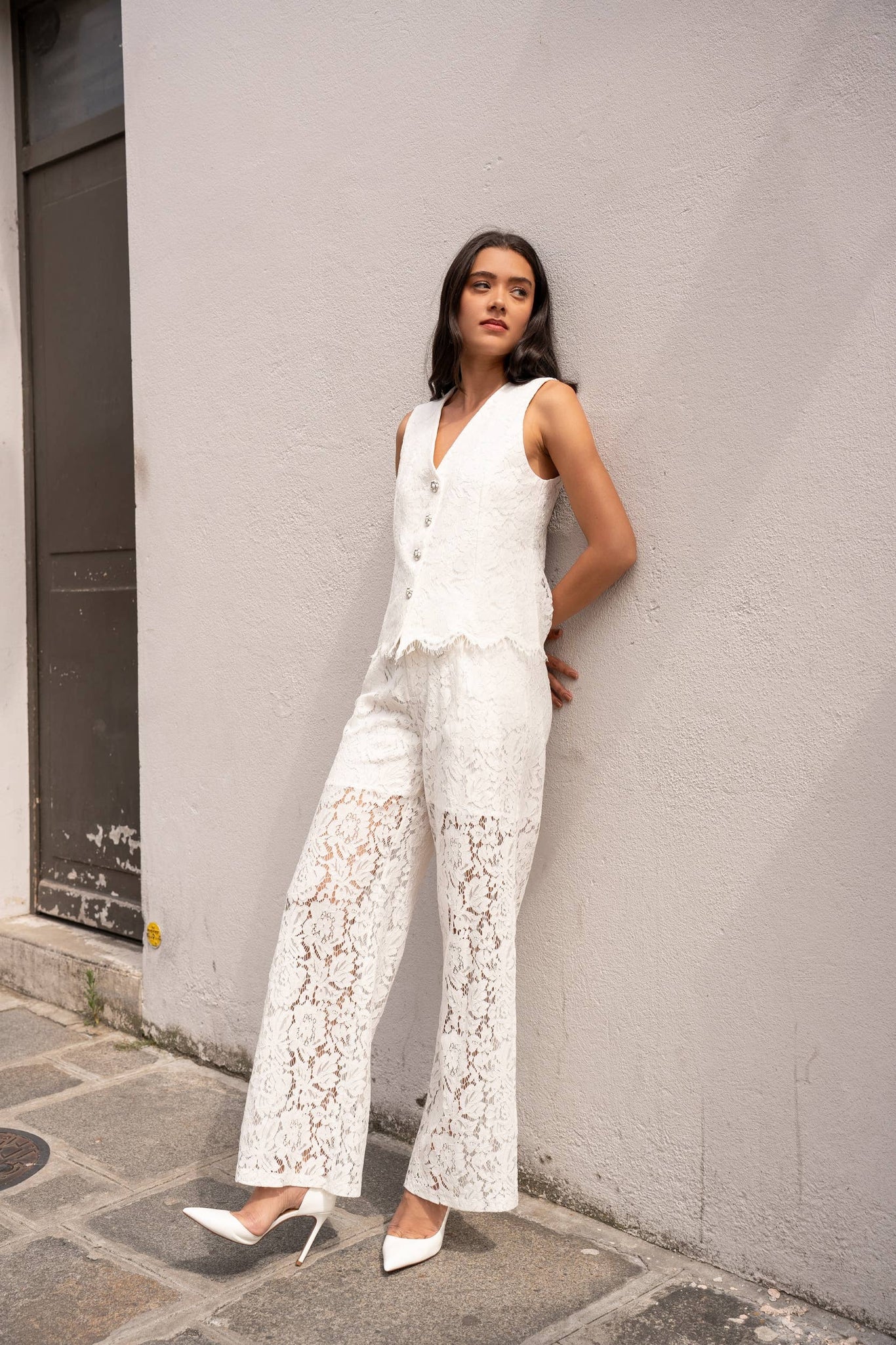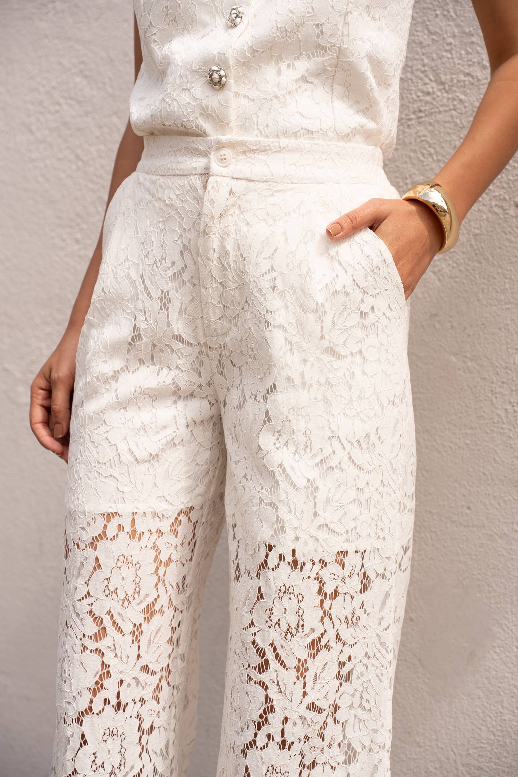 Korkeavyötäröiset pitsihousut:- Sivutaskut- Sisävuori (shortsien pituus polven yläpuolelle)- Vetoketju- ja nappisulkija edessä- Kuminauha takanaYhdistettävissä pitsiliivimme CK08502 kanssa samasta pitsimateriaalista tyylikkään kokonaisuuden aikaansaamiseksi valkoisiin juhliin.Malli on 176cm pitkä ja käyttää kokoa S.