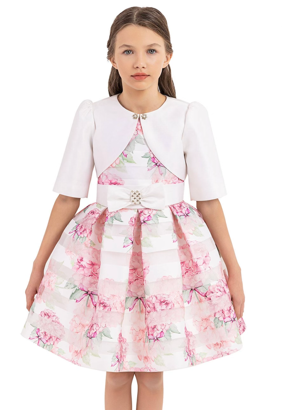 Tämä upea kukkakuvioinen mekko on täydellinen valinta juhliin, häihin tai muihin erityisiin tilaisuuksiin. Mekossa on pääliskerroksessa läpinäkyvää sekä kukkakuosia kerroksittain, mikä tekee siitä uniikin. Vyötäröllä on tyttömäinen rusetti. Asuun kuuluu mekko sekä valkoinen bolerojakku.