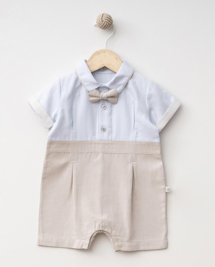 Tyylikäs vauvan potkupuku, jossa on kauluspaita-kaulus ja irrotettava rusetti. Käytännöllinen nepparikiinnitys haaroissa helpottaa pukemista ja vaipanvaihtoa. Vaaleansininen paita yhdistettynä beigeen alaosaan on klassinen ja tyylikäs väriyhdistelmä. Materiaalina on pehmeä ja joustava puuvilla.