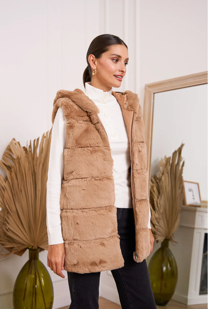 Kohota talvivaatekaappisi tällä ylellisellä kamelin sävyisellä puffiliivilla. Pehmeät tekoturkiset tikatut paneelit ja mukava huppu tekevät tästä hihattomasta mallista täydellisen kerrostettavan rullakaulusneuleiden ja pitkähihaisten paitojen päälle.