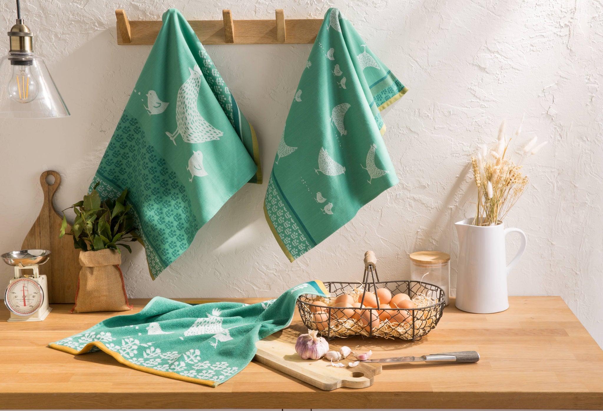 Kuvittele hetki: Kun kuivaat astioita tällä suloisella kanapyyhkeellä, sen raikas vihreä-keltainen värimaailma ja hauskat kanat tuovat hymyn huulillesi ja muistuttavat rauhallisesta maalaistunnelmasta.