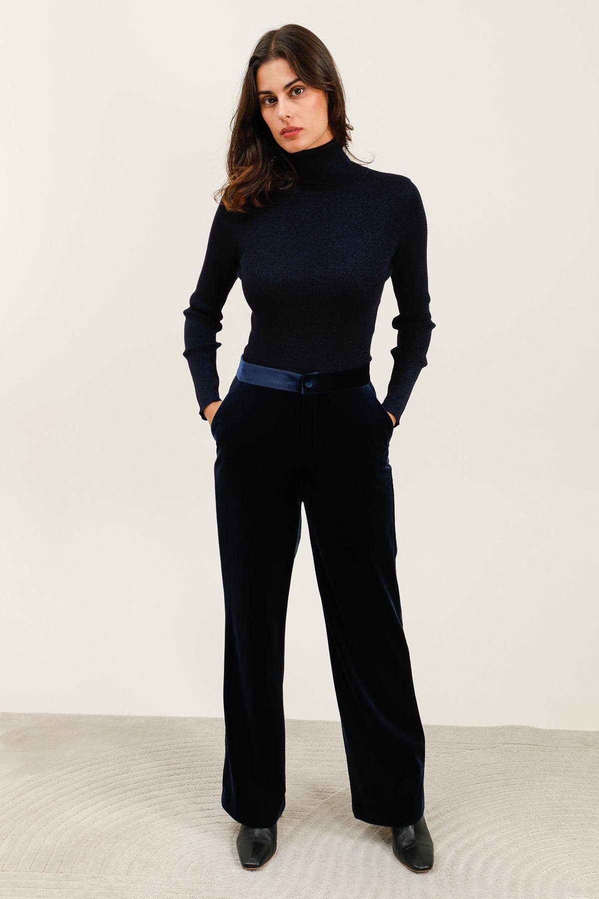 Tämä paita on tiivis pooloneule kiiltävästä raidallisesta neuleesta. Valmistettu pehmeästä ja joustavasta materiaalista, joka istuu hyvin ylävartaloon. Hihat ovat pitkät ja kokonaisilme on elegantti ja hillitty. Tämäntyyppistä paitaa käytetään usein rennossa tyylissä tai se voidaan yhdistää muodollisempiin asuihin riippuen tyylistä. Kuvassa paita on yhdistetty korkeavyötäröisiin samettihousut, mikä lisää klassista tyyliä kokonaisuuteen.